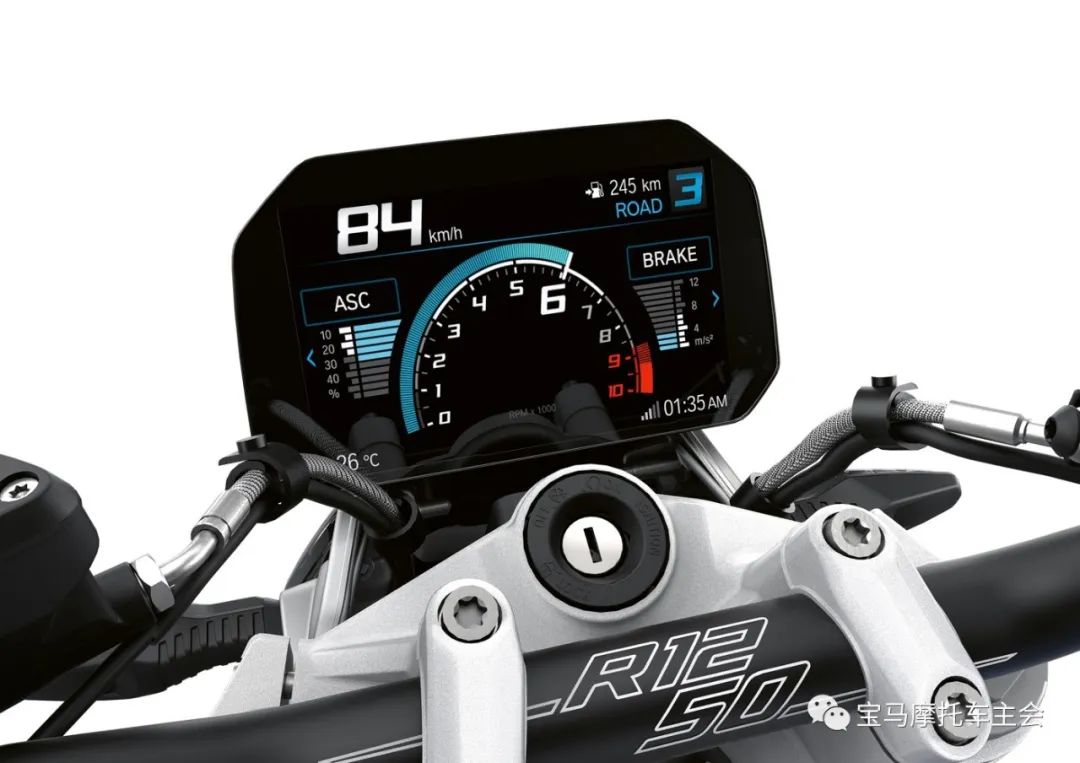 TFT彩色仪表,标配“运动”屏幕。和以前一样,新的R1250R配备了TFT彩色仪表盘。出色的可读性、清晰的菜单导航和高度集成的操作理念一直是摩托车界天花板般的存在。骑手可以自行定义各种屏幕功能。同时“运动”屏幕还可以提供当前和最大倾斜角度以及弯道ABS和DTC控制干预的实时信息显示。2 Z! Z$ b" q- {6 e" c& {6 g! |